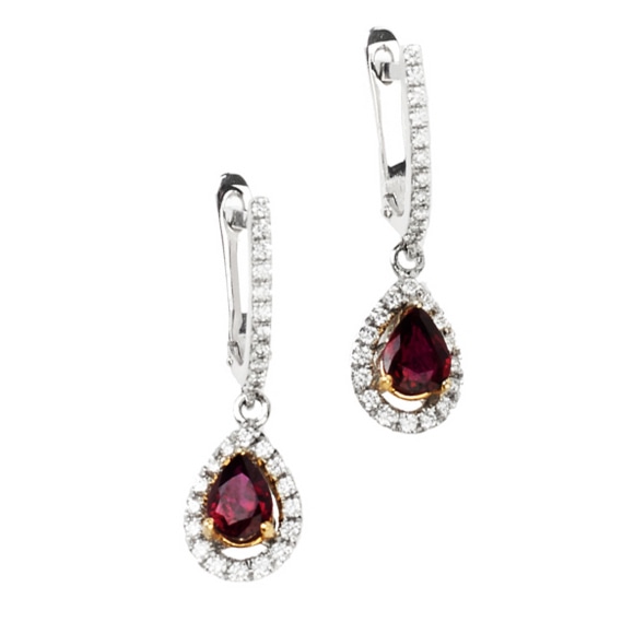 Kolczyki na zapięcie angielskie wykonane w białym złocie z rubinami o szlifie łezki. Kamienie centralne otoczone brylantową galeryjką tworzą ponadczasową kompozycję.