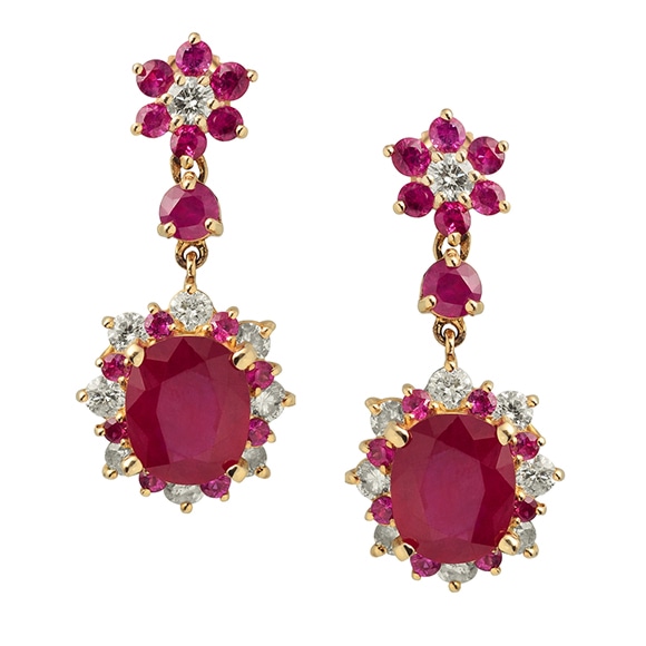 Stylowo skomponowane kolczyki na sztyfty wykonane w żółtym złocie z rubinami oraz wkomponowanymi brylantami. Wisząca kompozycja tworzy unikatowe połączenie klasycznych brylantów z intensywnością żywego odcienia czerwieni.