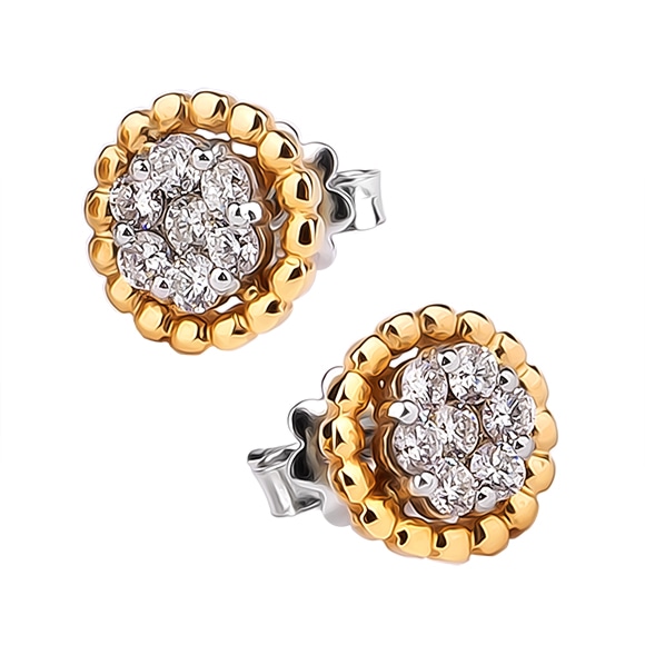 Kolczyki na sztyfty wykonane w dwóch kolorach złota z centralnie oprawionymi brylantami. Same oprawy tworzą formę rozetki która została otoczona prezcyzyjnie wykonanym zdobieniem.