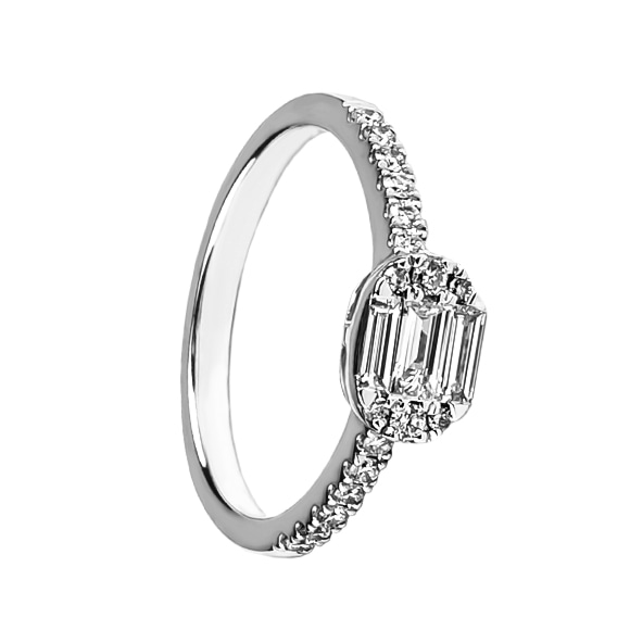 Pierścionek wykonany w białym złocie z centralną kompozycją diamentową w formie mozaiki. Kunsztu wykończenia dopełnia wysadzana brylantami obrączka.
