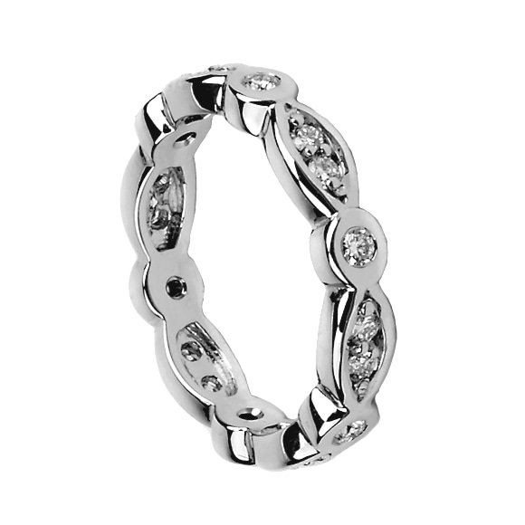 Pierścionek ring wykonany w białym złocie z oprawionymi brylantami. Obrączka składa się z elementów inspirowanych szlifem diamentów w kształcie markizy.