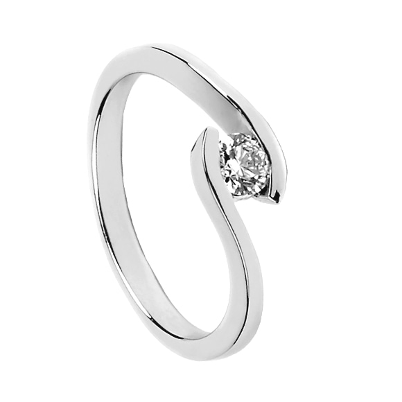 Pierścionek wykonany w białym złocie z asymetryczną obrączką która tworzy fantazyjną oprawę brylantu.