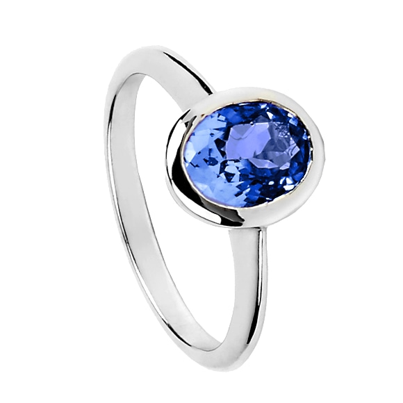 Pierścionek wykonany w białym złocie z centralnym oprawionym na gładko tanzanitem o szlachetnym szlifie owalnym.