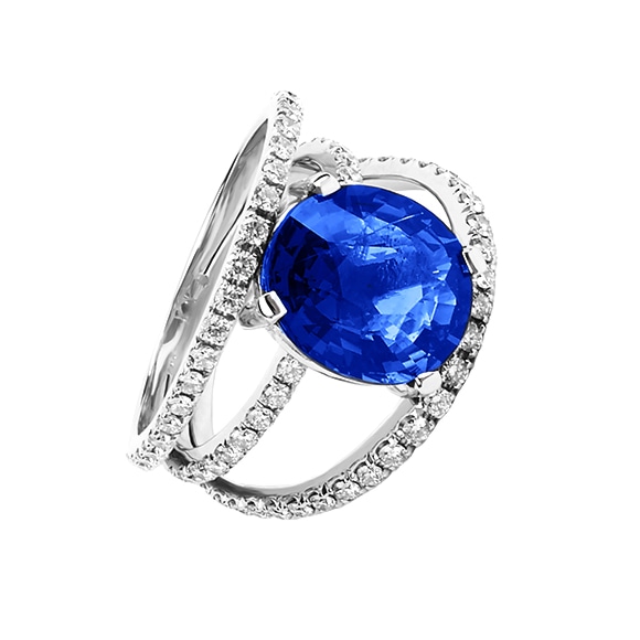 Pierścionek wykonany w białym złocie w formie potrójnej rozszerzanej obrączki. Do kompozycji wpleciono centralnie unikatowy szafir, a całość formy zaprojektowano w duchu nowoczesnego designu.