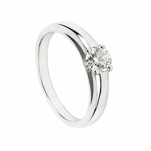 Pierścionek wykonany w białym złocie z centralnym brylantem w oryginalny sposób wkomponowanym w obrączkę.