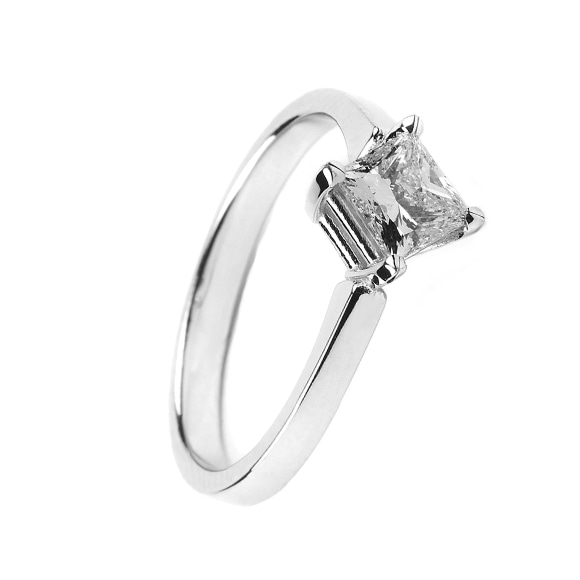Pierścionek wykonany w białym złocie z minimalistycznie oprawionym poprzecznie diamentem w gustownym szlifie princess.