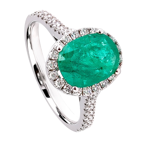 Pierścionek wykonany w białym złocie z centralnie oprawionym szmaragdem, którego unikatowy kolor podkreślono brylantową galeryjką. Całość kompozycji gustownie uzupełniają oprawione w obrączce boczne brylanty.