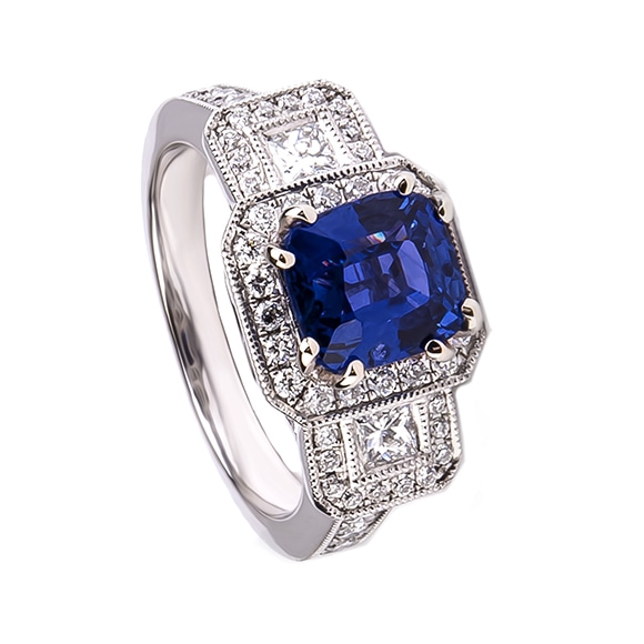 Pierścionek wykonany w białym złocie z centralnie zakutym w osiem łapek szafirem, inspirowany formami stylu art deco. Stylizowana forma obrączki precyzyjnie wysadzona została klasycznymi brylantami o szlifie brylantowym oraz nietuzinkowym szlifie typu princess.