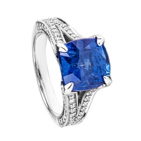 Pierścionek wykonany w białym złocie z centralnie osadzonym w cztery łapki szafirem. Całości dopełnia skomponowana kompozycja brylantów oprawionych w rozchylonej obrączce idącej ku oprawie głównego kamienia.