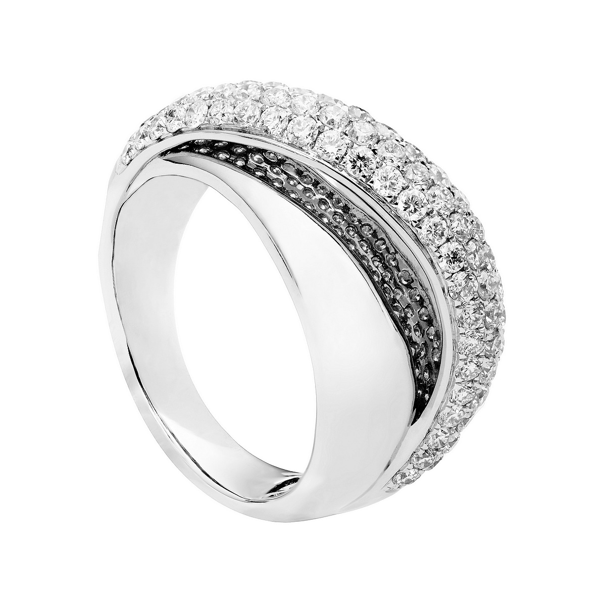 Pierścień wykonany w białym złocie z asymetryczną taflą brylantową o kształcie szykownej fali.