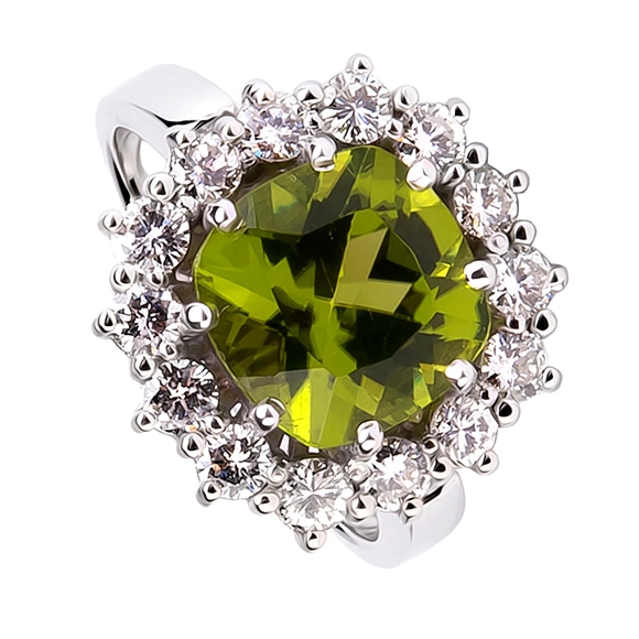 Pierścionek wielokamieniowy wykonany w białym złocie z centralnie oprawionym oliwinem oraz brylantami w formie stylizowanej galeryjki.