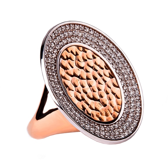 Stylowy pierścień wykonany w różowym złocie z nowoczesnym centralnym młotkowanym motywem otoczonym trzema rzędami klasycznych brylantów.