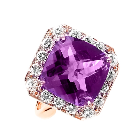 Pierścionek wielokamieniowy wykonany w różowym złocie z centralnie oprawionym ametystem oraz brylantami w formie stylizowanej galeryjki wykonanej z klasycznych brylantów.