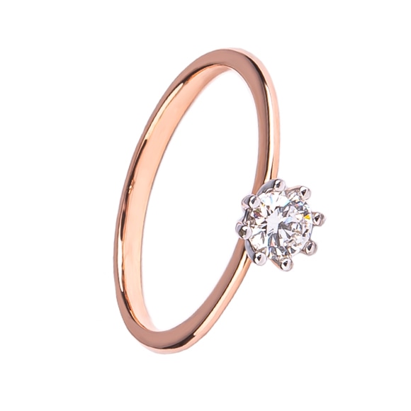 Pierścionek którego obrączka została wykonana w różowym złocie zaś ośmiołapkowa korona w białym dla podkreślenia piękna brylantu centralnego.