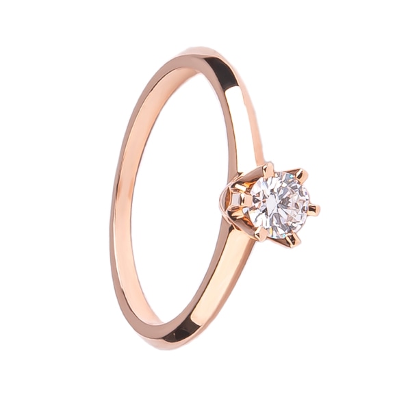 Pierścionek klasyczny wykonany w różowym złocie z oprawionym w tradycyjną koronę unikatowym brylantem.