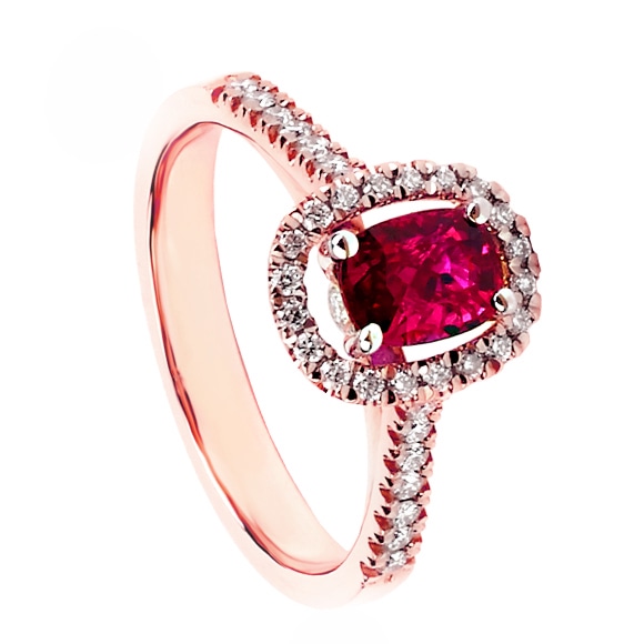 Pierścionek wykonany w różowym złocie z centralnie oprawionym rubinem którego unikatowy kolor podkreślono brylantową galeryjką. Całość kompozycji gustownie podkreślają oprawione w obrączce boczne brylanty.