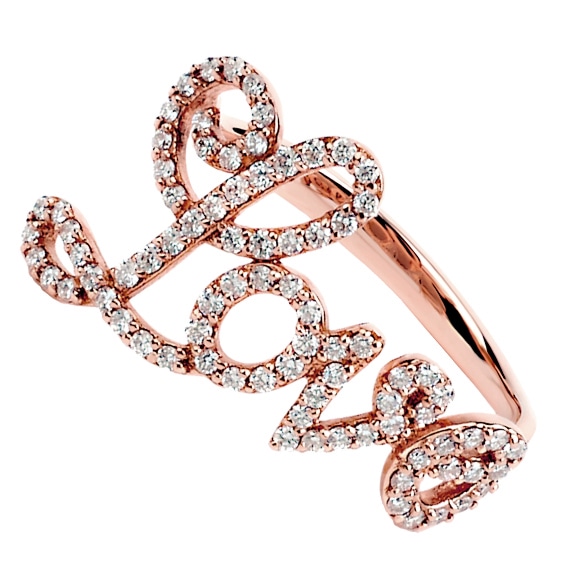 Unikatowy pierścionek wykonany w różowym złocie ze stylową oprawą ponadczasowych brylantów układająca się w napis "Love".