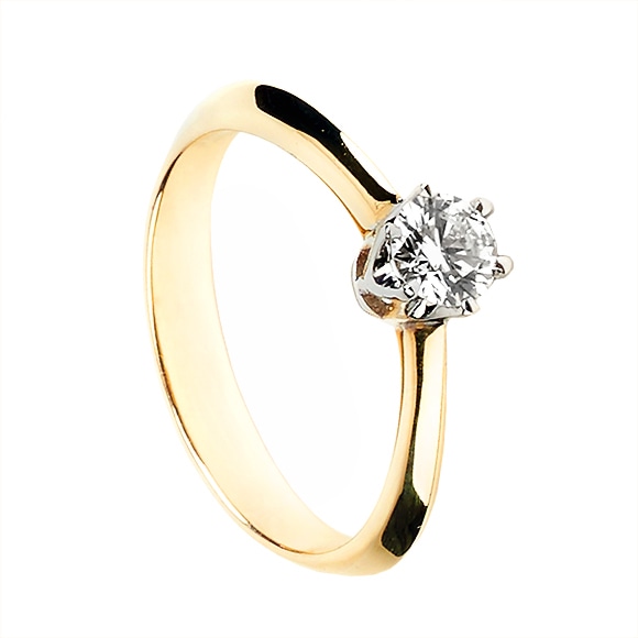 Pierścionek którego obrączka została wykonana w żółtym złocie zaś sześciołapkowa korona w białym dla podkreślenia piękna brylantu centralnego.