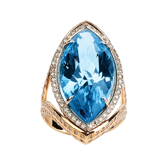 Pierścionek wykonany w żółtym złocie z unikatowym topazem o kształcie markizy. Wyszukana kompozycja obrączki precyzyjnie została dopasowana do centralnego kamienia tworząc formę galeryjki wysadzanej brylantami.