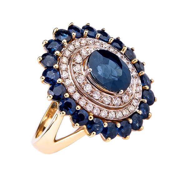 Elegancki pierścionek wykonany w żółtym złocie z centralnie oprawionym szafirem. Podwójna brylantowa galeryjka podkreślająca kamień centralny dodatkowo została precyzyjnie otoczona rzędem szafirów.