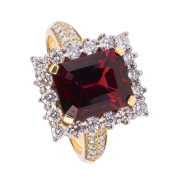 Pierścionek wykony w żółtym złocie z centralnie oprawionym granatem którego kształt podkreśla prostokątna galeryjka. Całość została zwieńczona obrączką częściowo wysadzaną podwójnym rzędem brylantów.