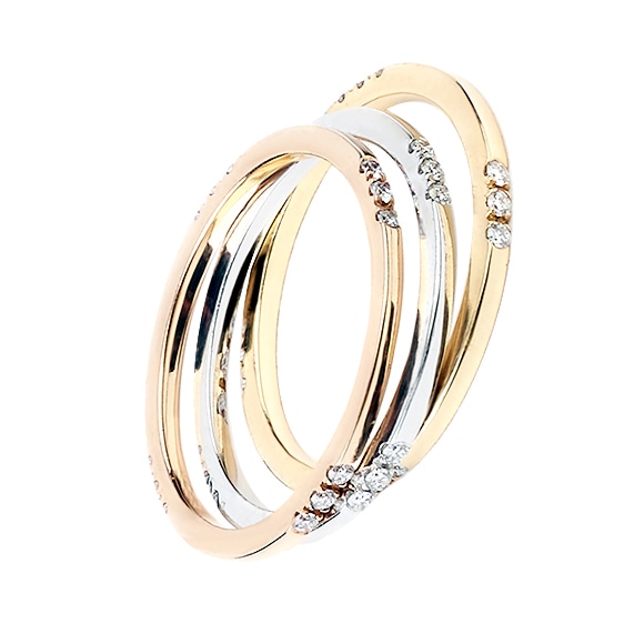Zestaw trzech nowoczesnych pierścionków typu ring, które zostały wykonane w trzech kolorach złota: różowym, białym oraz żółtym. Na możliwość modyfikacji noszenia z inną biżuterią bądź osobno zestawu pozwalają różne odcienie wykonania.
